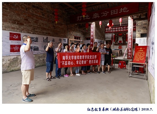 7月20日至7月22日,继续教育学院党支部组织支部11名党员开展了“不忘初心,牢记使命”的支部活动,全体党员参观了红色流华湾、资兴市苏维埃政府旧址、移民博物馆,回顾湘南起义波澜壮阔的红色历史画卷,支部全体党员在资兴苏维埃政府旧址重温了入党誓词,支部书记曾庆生同志给大家上了“不忘初心,牢记使命”党课。